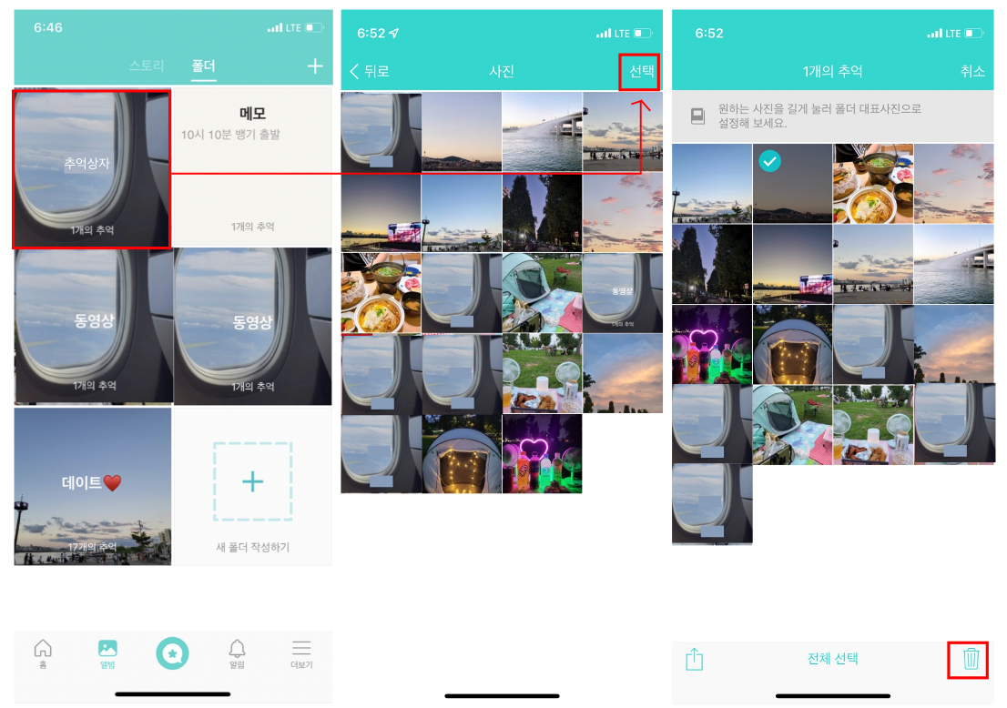 비트윈 앱을 사용하다보면 헷갈릴때가 많다. 특히 사진을 정리할때 사진첩에서는 사진첩의 상세 화면에서 사진을 삭제할 수 있도록 하지만 추억 상자에서는 상세 일괄적으로 여러개의 사진을 선택해서 삭제를 할 수 있도록 했다.