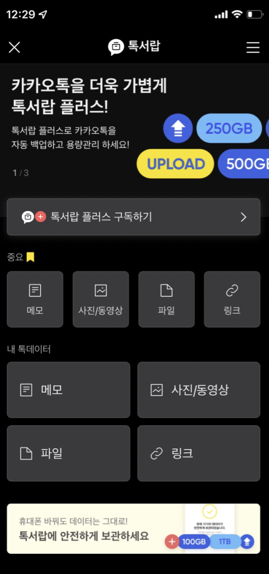 카카오톡의 톡 서랍 기능 메인 화면인데 기능별로 정리가 잘 되어 있는 것을 확인할 수 있고 일관적인 사용 경험을 제공한다.