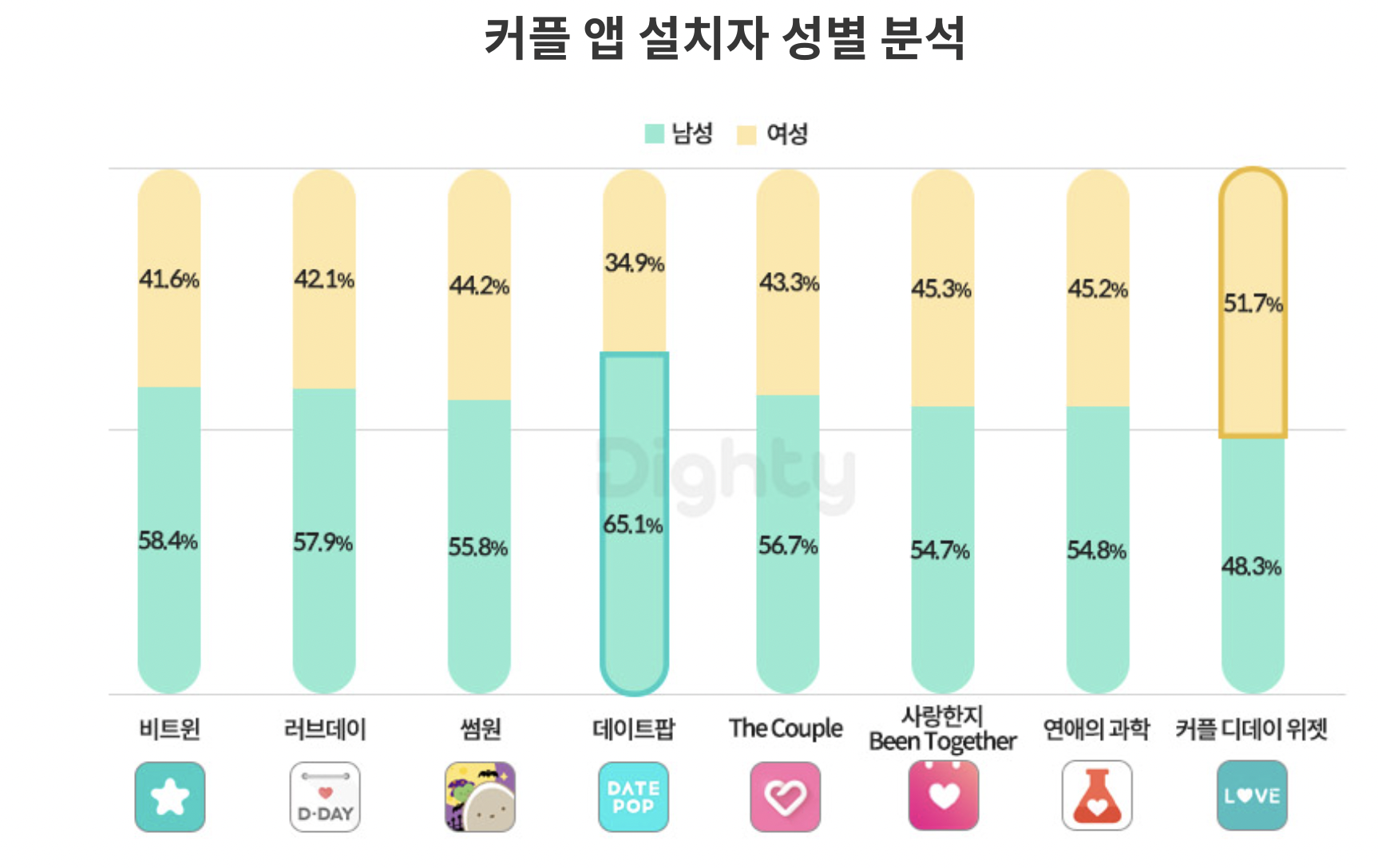 남성 비중이 가장 높은 앱은 데이트 준비를 도와주는 장소 추천 앱인 데이트팝, 여성 비중이 가장 높은 앱은 커플 기념일,