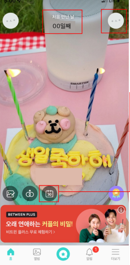 비트윈의 홈 화면은 직관적으로 연인들에게 필요한 기능들이 위치해있다.